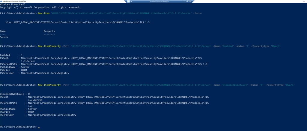 New-Item 'HKLM:\\SYSTEM\\CurrentControlSet\\Control\\SecurityProviders\\SCHANNEL\\Protocols\\TLS 1.3\\Server' -ForceNew-ItemProperty -Path 'HKLM:\\SYSTEM\\CurrentControlSet\\Control\\SecurityProviders\\SCHANNEL\\Protocols\\TLS 1.3\\Server' -Name 'Enabled' -Value '1' -PropertyType 'DWord'New-ItemProperty -Path 'HKLM:\\SYSTEM\\CurrentControlSet\\Control\\SecurityProviders\\SCHANNEL\\Protocols\\TLS 1.3\\Server' -Name 'DisabledByDefault' -Value '0' -PropertyType 'DWord'