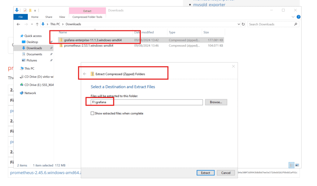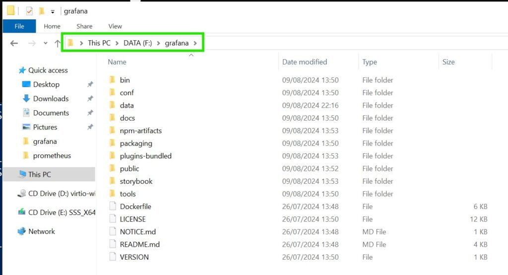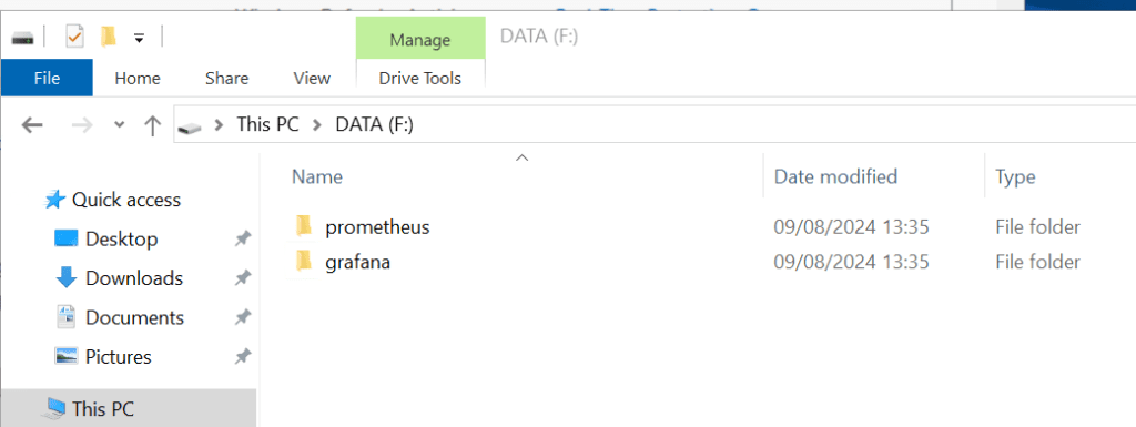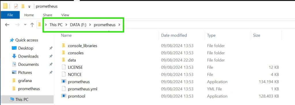 Since we will not be conserned with keeping default folder names that were generated through the extraction process we will move everything one folder down. So the content of F:\prometheus\prometheus-2.53.1.windows-amd64 will be moved back down to F:\prometheus\. Same for Grafana.