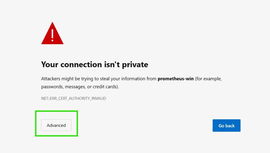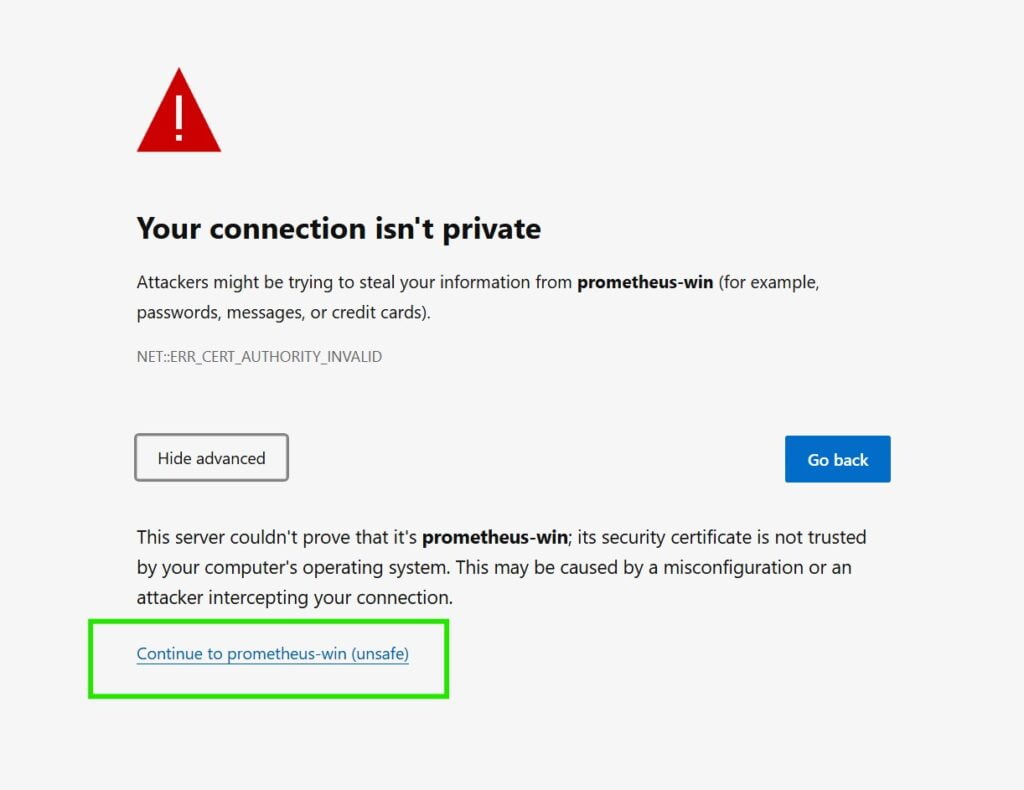 prometheus.exe --web.config.file=F:\prometheus\web-config.ymlNow if you call the same URL as before but with HTTPS:// instead of HTTP, you will get a prompt: