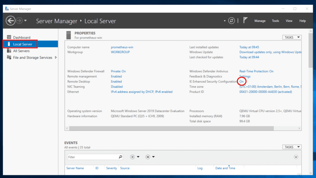 - Server Manager -> Local Server -> Disable IE Enhanced Security Configuration