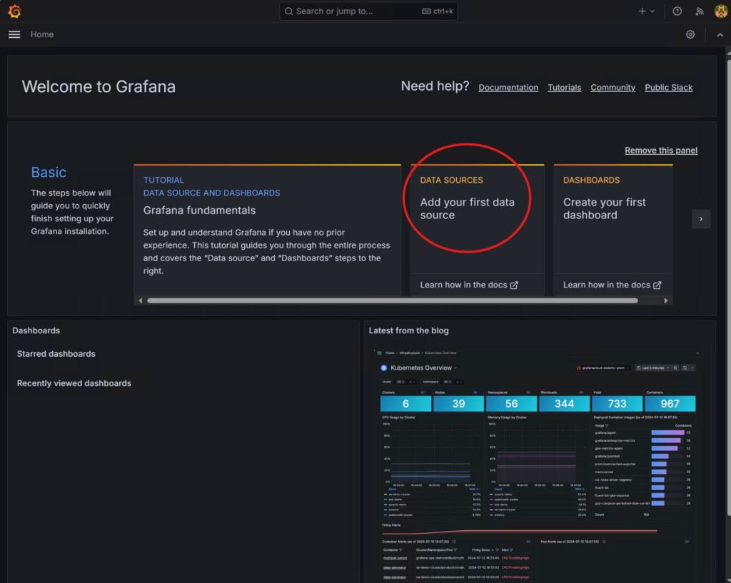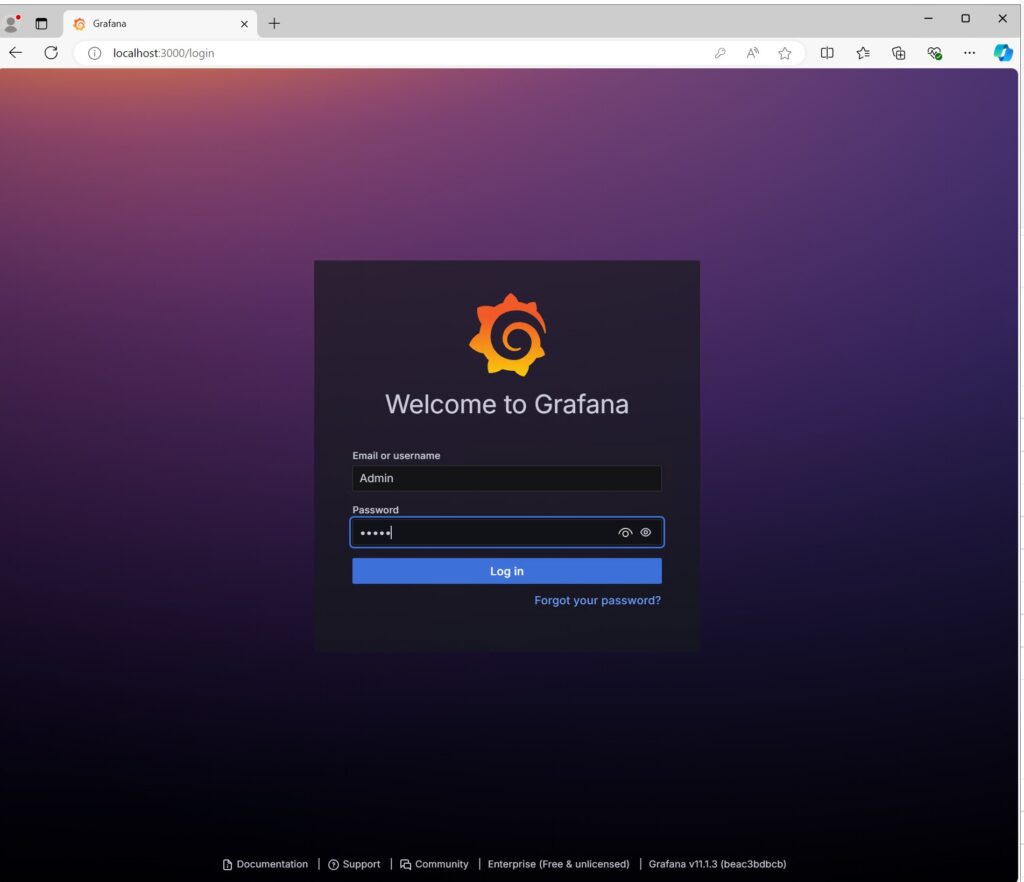 Login to Grafana via https://localhost:3000 or remotely via https://<yourhostname, fqdn or IP address>:3000 with the default credentials Admin/admin