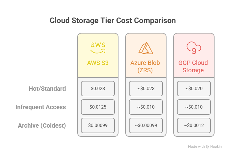 The at-rest storage costs for the deepest archives are nearly identical: AWS S3 Glacier Deep Archive and Azure Archive are both priced at approximately $0.00099 per GB/month. GCP Archive is slightly higher at $0.0012 per GB/month.