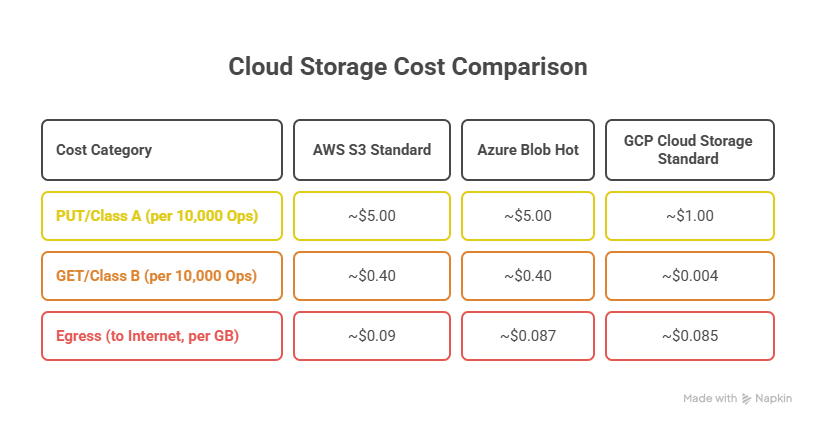 AWS S3 and Azure Blob Hot tiers typically charge approximately $0.40 per 10,000 GET (read) requests. In contrast, GCP Cloud Storage Standard charges Class B operations as low as $0.004 per 10,000 operations. This is an operational cost difference of approximately